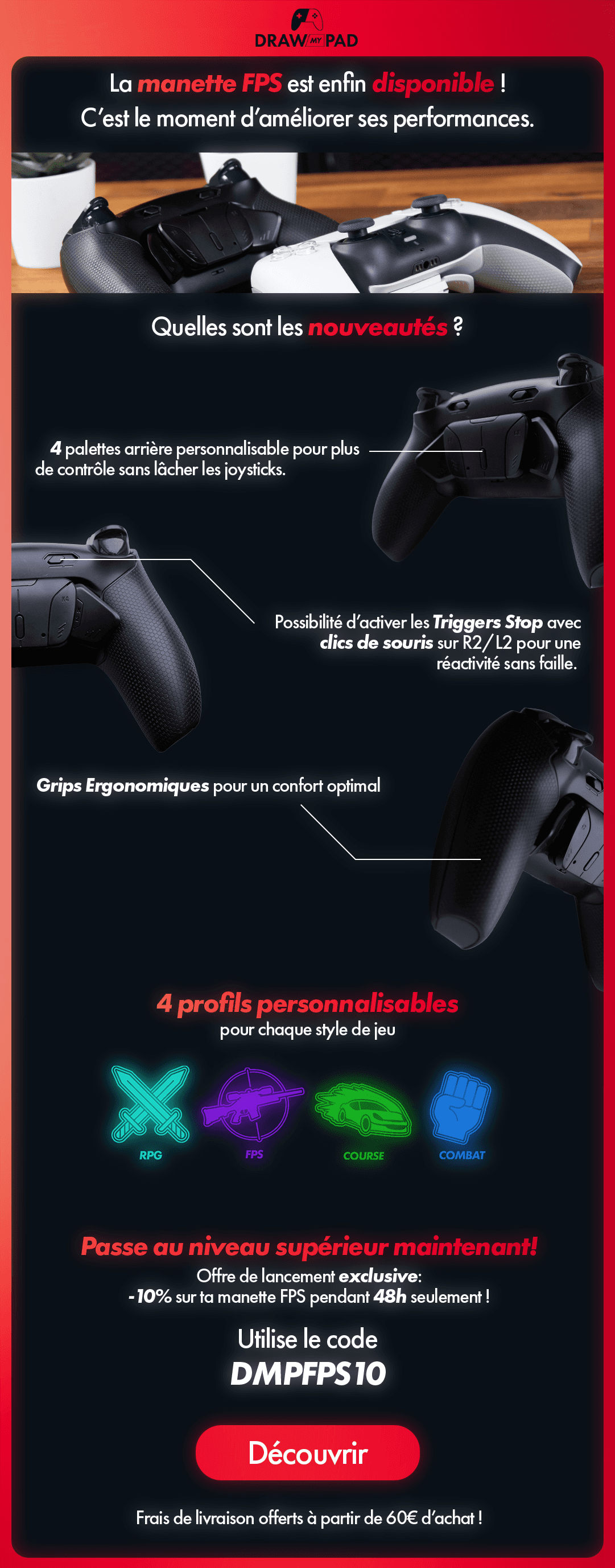 J'ai eu la chance d'effectuer un stage de 2 mois chez Draw my Pad en tant que graphiste et monteur vidéo. J'ai réalisé la direction artistique de leur nouvelle gamme de manette "FPS", ainsi que de nombreux supports visuels pour le site web, pour des publicités sur internet (Meta ads, Google ads) ou des posts sur les résaux sociaux (instagram, tiktok).